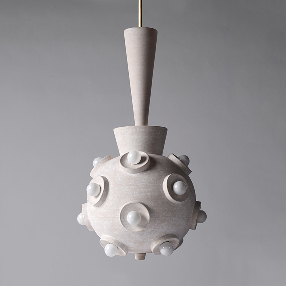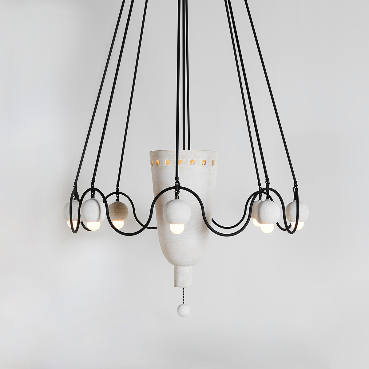 Ceramic artist Eric Roinestad draws inspiration from the glass forms of Tomaso Buzzi and Carlo Scarpa for his new collection of hanging lamps. The work expands on his previous explorations in lighting with new shapes, scale and complexity. His totemic floor lamps refer to the costume design of Oskar Schlemmer for the Bauhaus, as do his mask-like modernist wall sculptures.