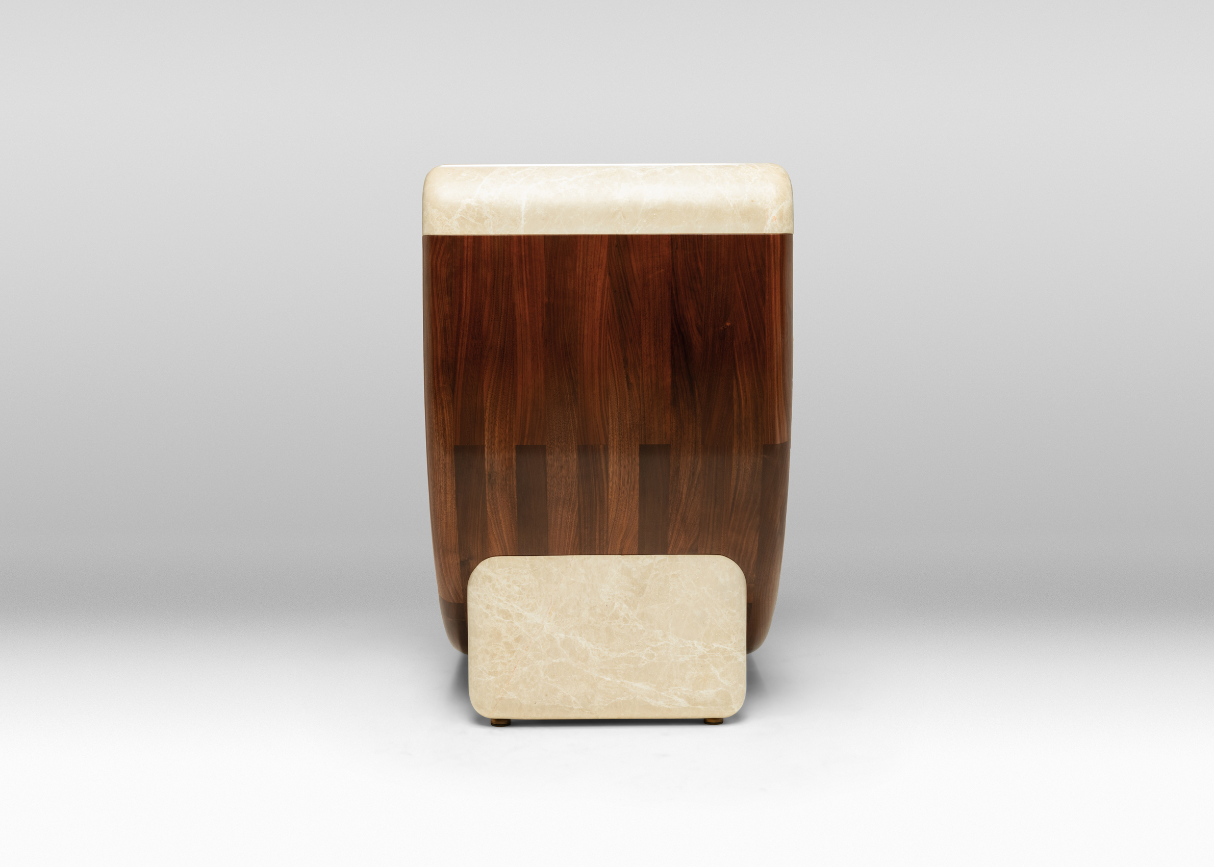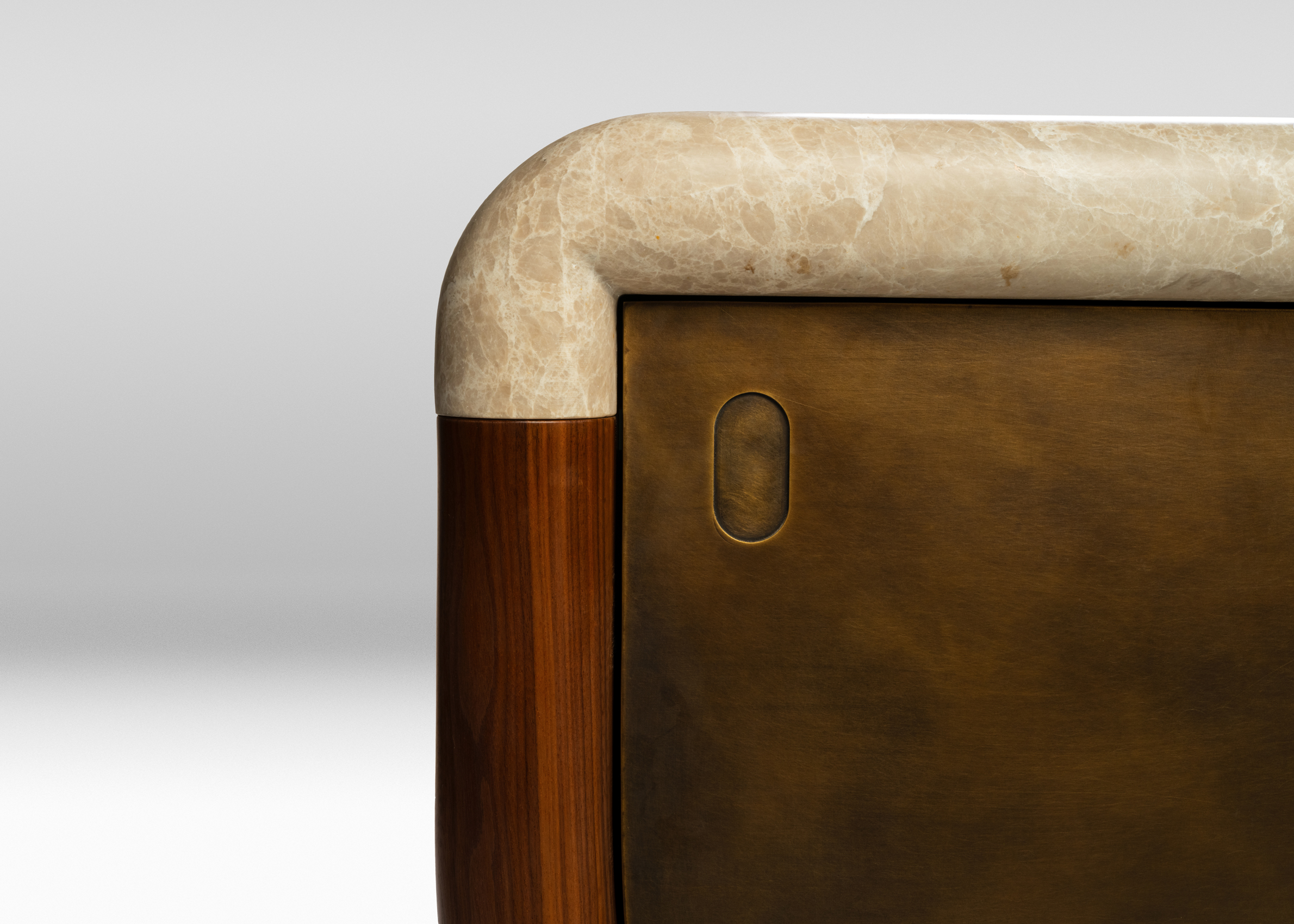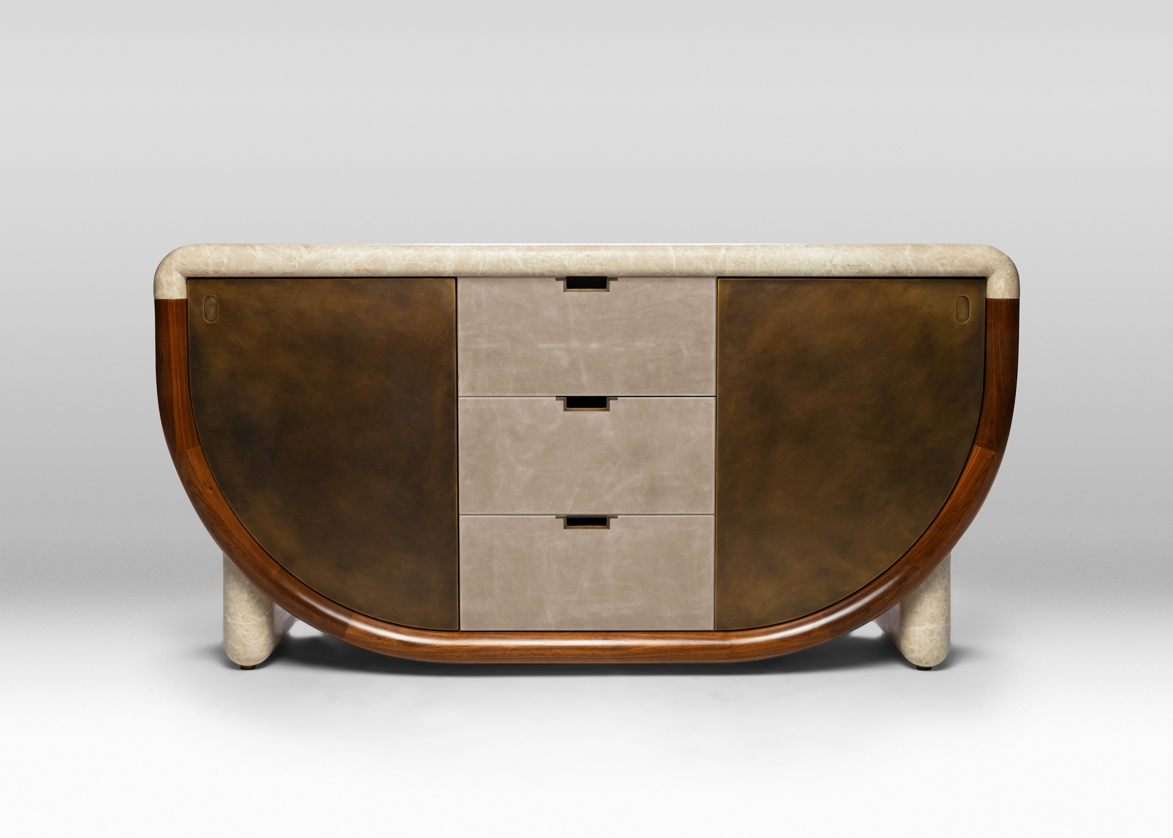 The Artic Credenza is an expansion of the Artic Wardrobe that was released in the Fall of 2019. This credenza pushes the boundaries of materiality with the continuation of its marble top, into the wooden frame and the addition of solid aged brass or steel doors with leather-wrapped drawer fronts.