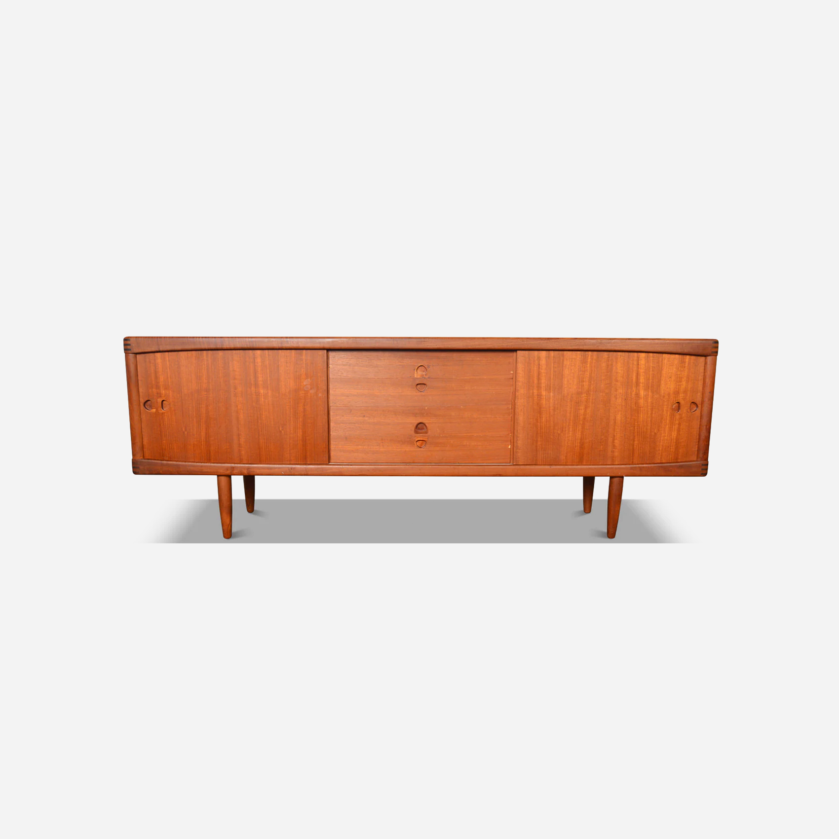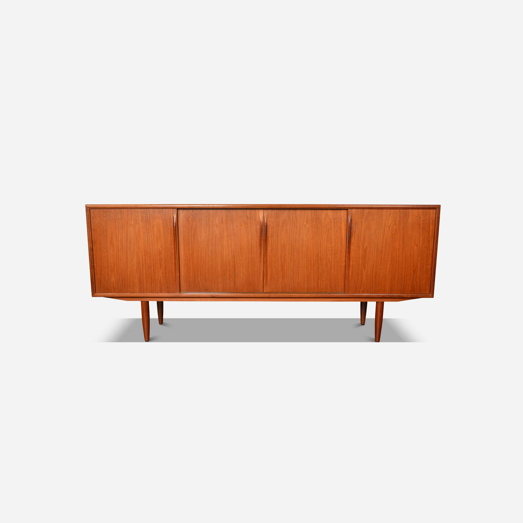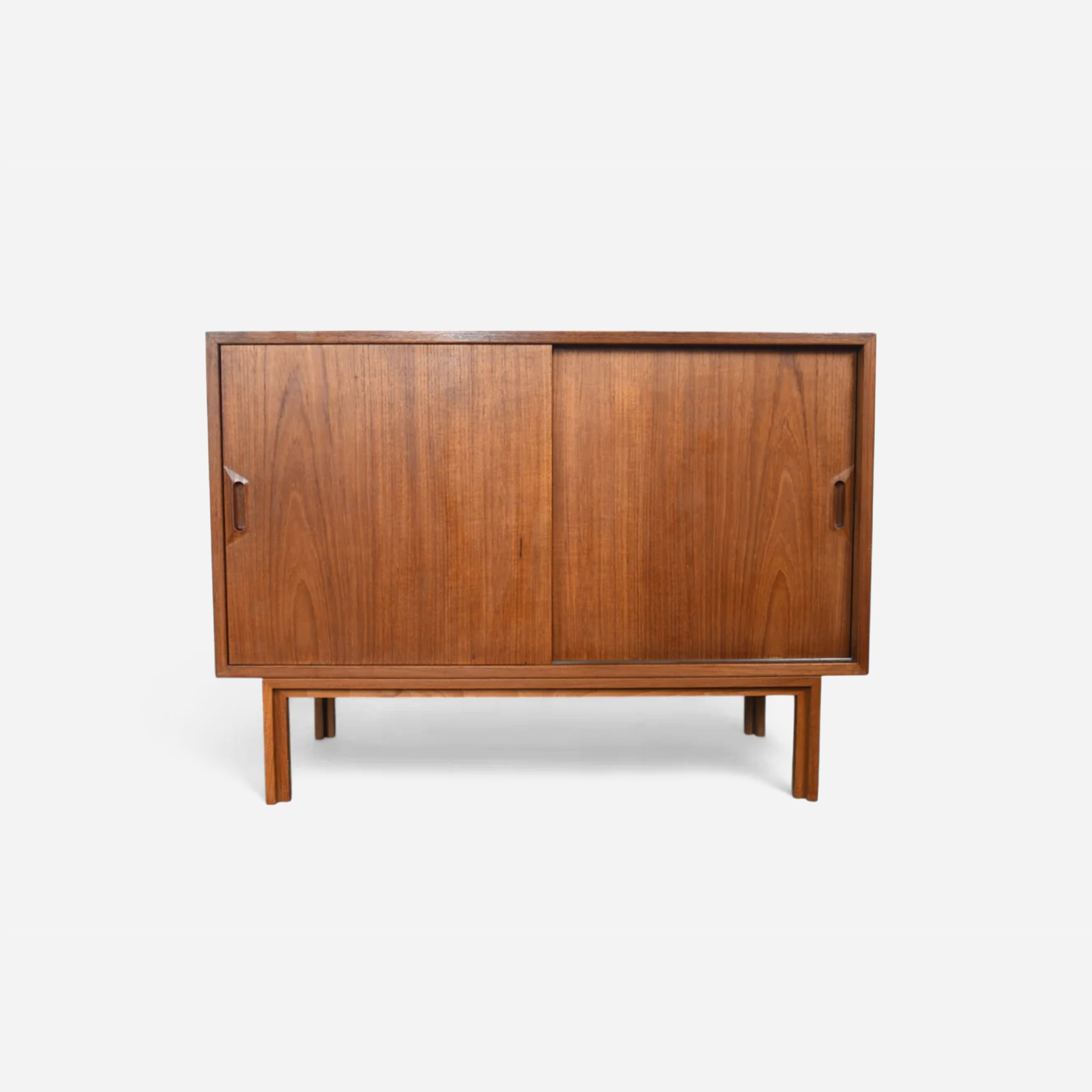 A Danish modern credenza in teak and afromosia, defined by clean lines and balanced proportions. Notable for “Fonseca” series, afromosia accents. Designed for everyday use, it offers generous enclosed storage with a long surface for display.