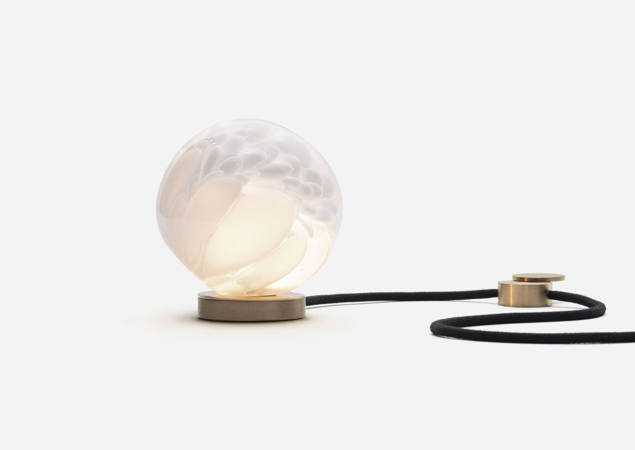 118t is a single hand-blown glass pendant used with the table light hardware, which includes an integral dimming system housed within a sleek brass cylinder.