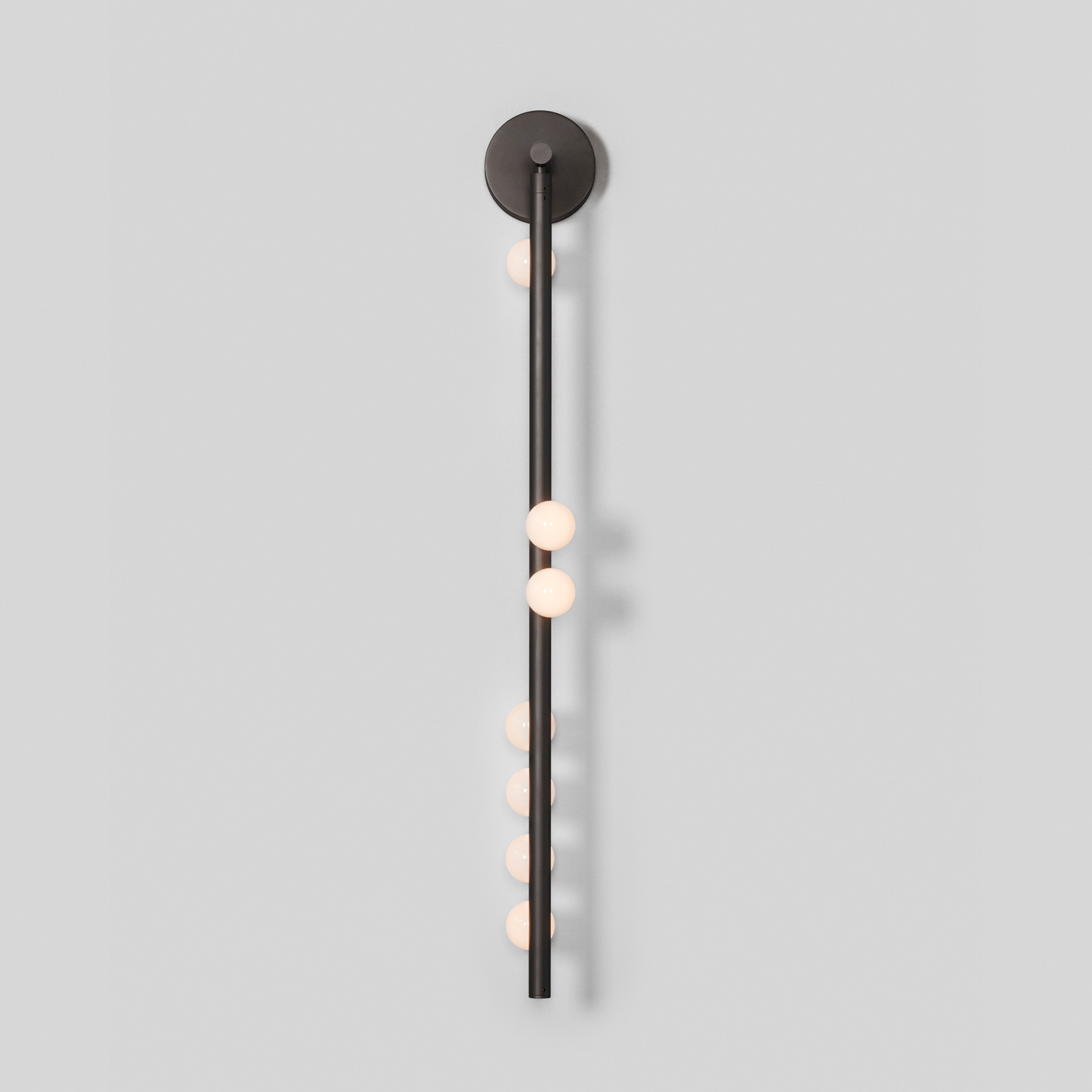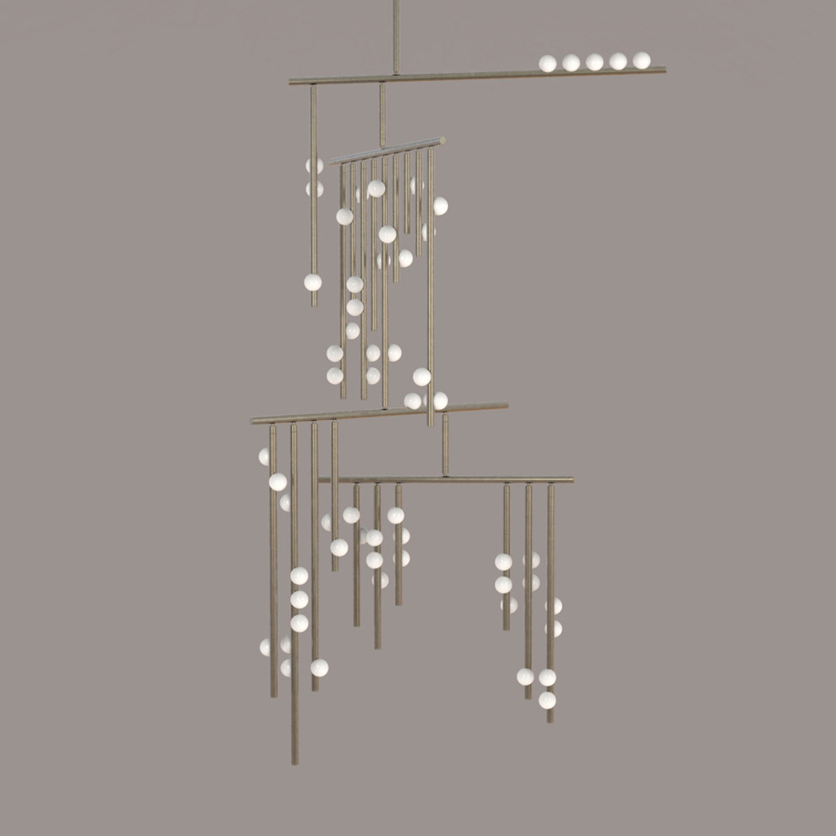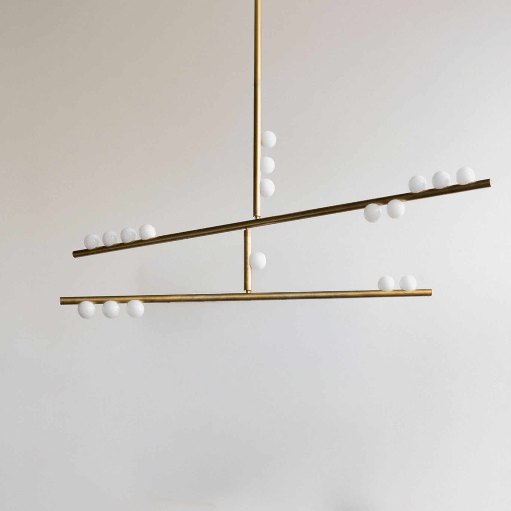 Piet Mondrian's influence on modern abstraction inspired Lindsey's Drop System, where she used brass tubing and glass globes to explore the balance between rigidity and fluidity. The custom-configurable fixture elegantly plays with vertical and horizontal elements while offering various finishes for a unique collection.