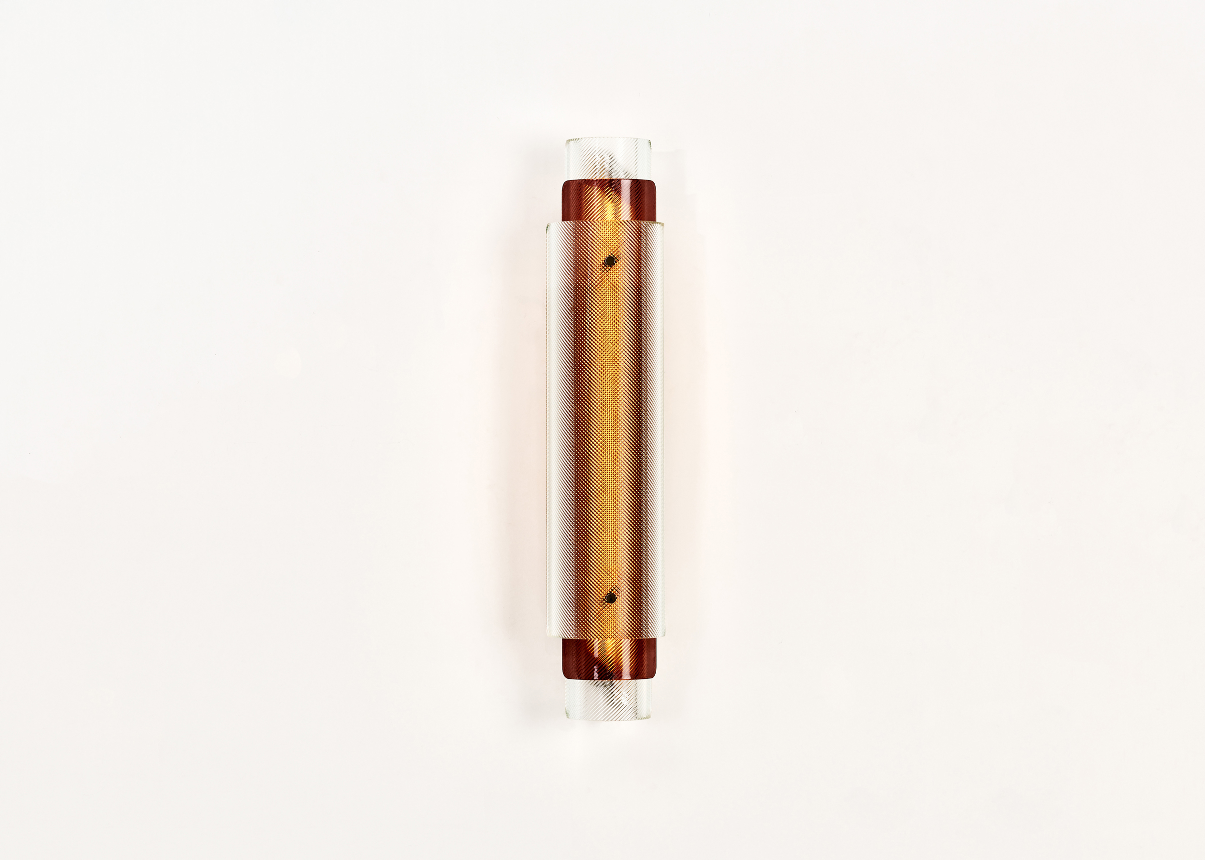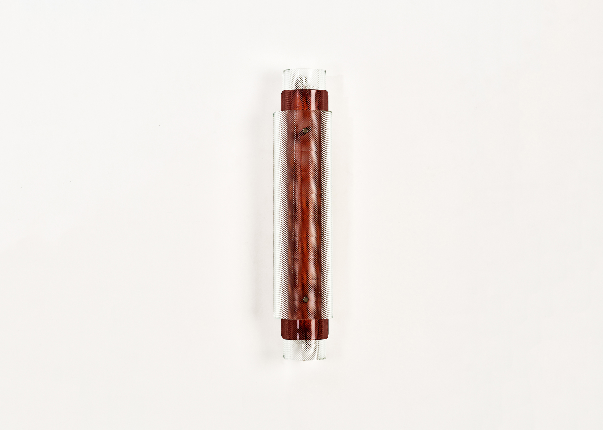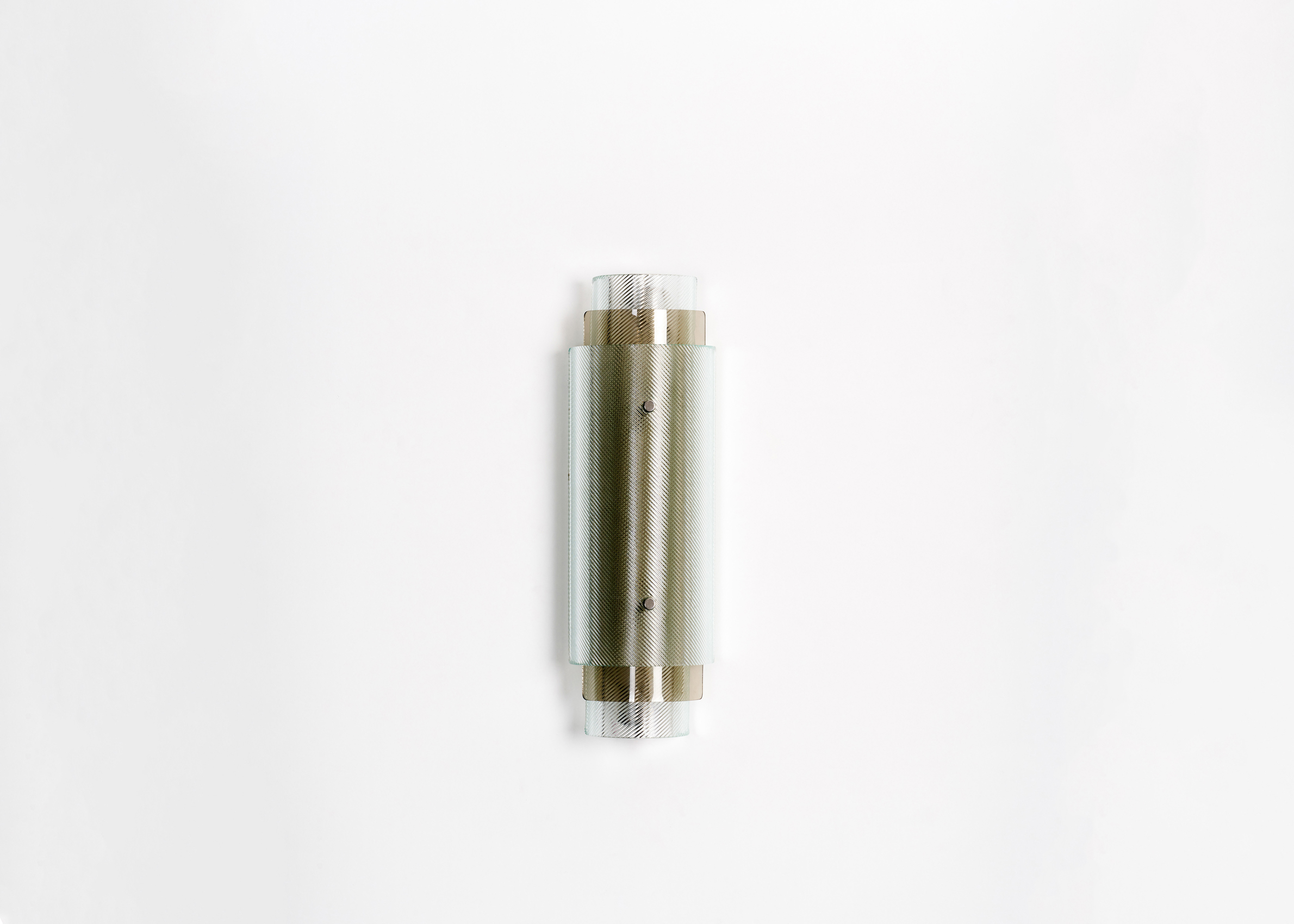 Industrial glass is transformed into a stunning decorative element in the Spindle lamp series as cylindrical shapes of fluted glass are superimposed in opposite directions to create a hypnotic optical illusion emphasized by the inclusion of colored glass. The curved glass is realized by an expert artisan and sits inside a stainless steel structure.