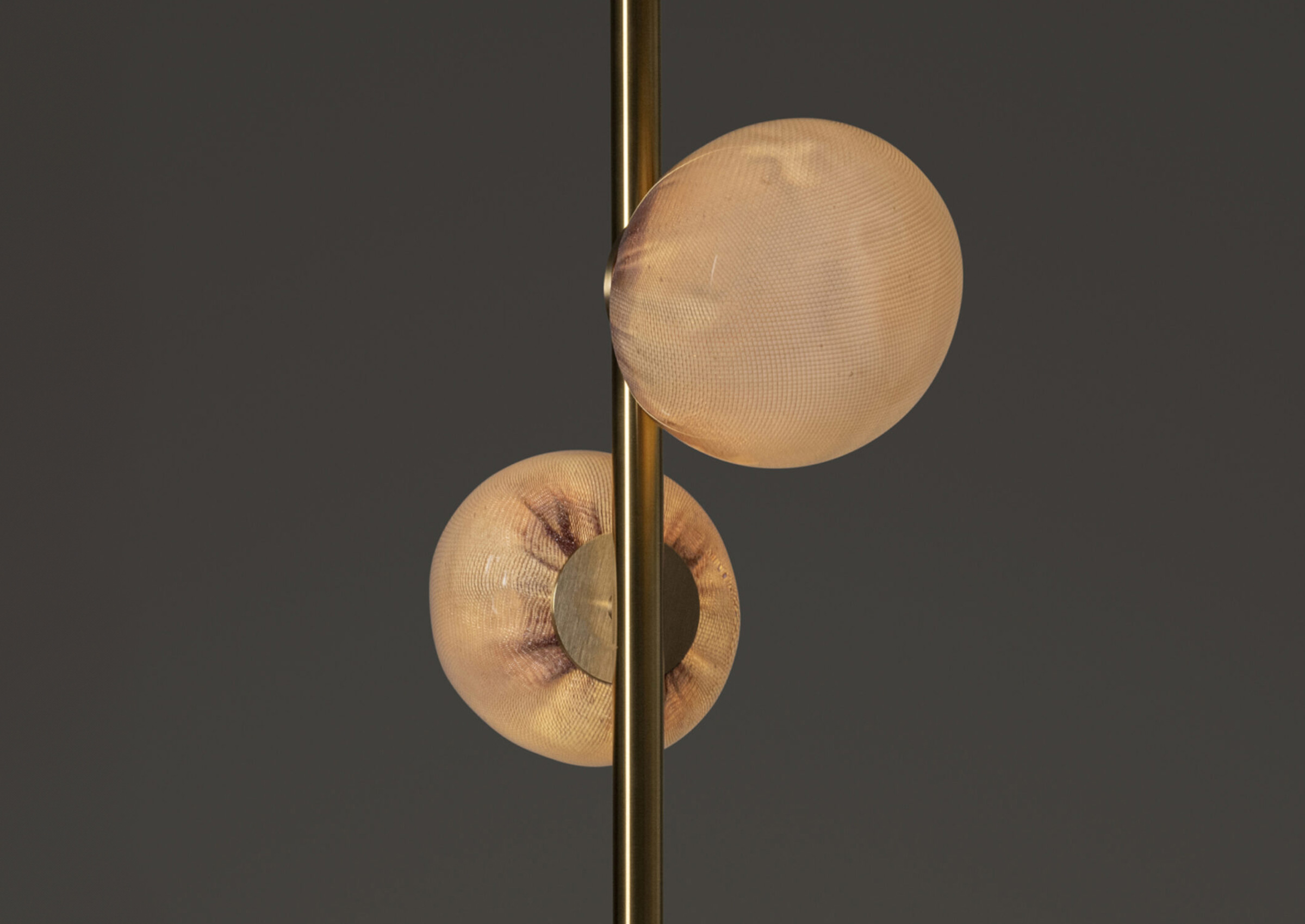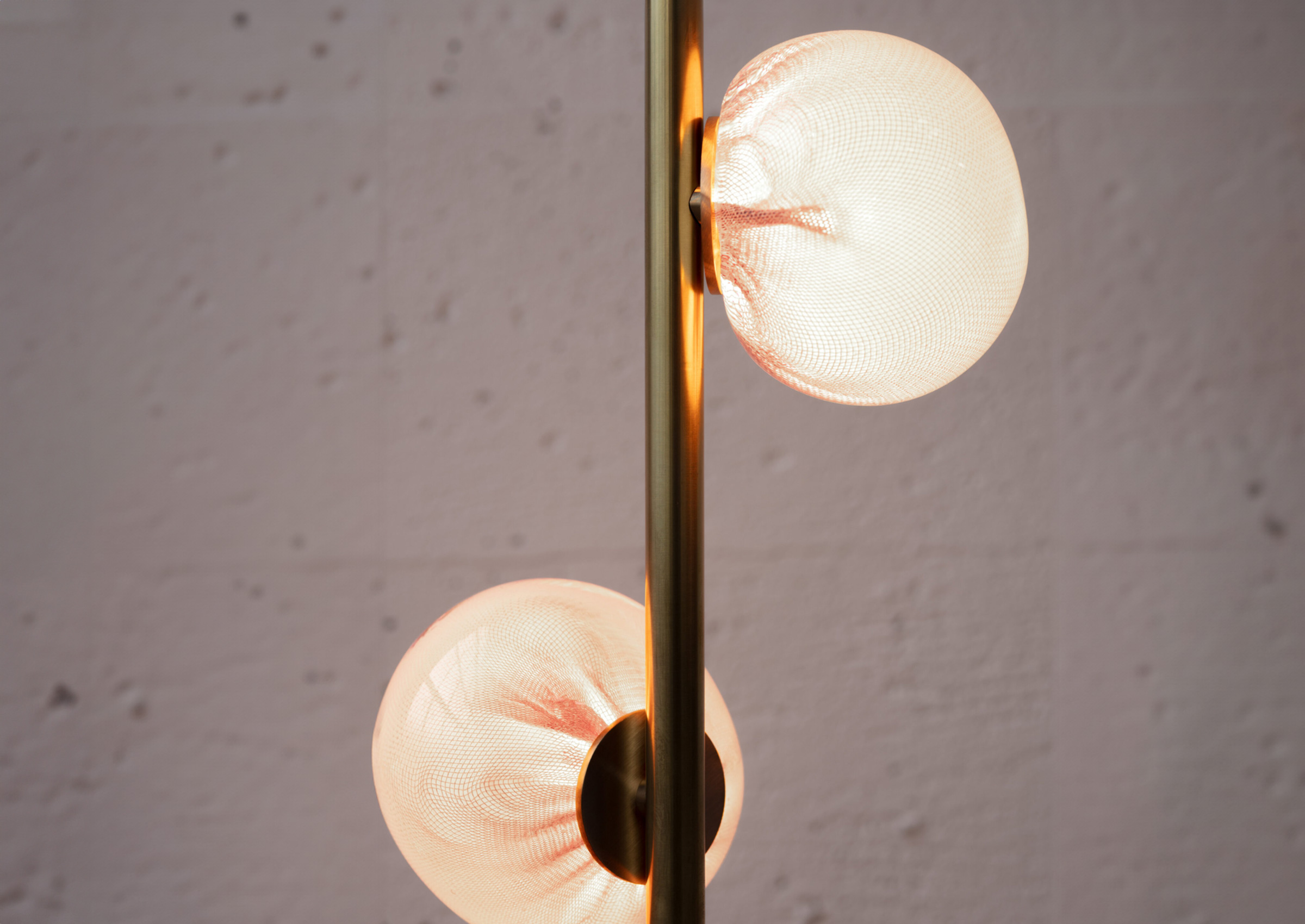 84.6 is composed of six hand-blown glass pendants mounted on a long stem available in a brass finish and multiple height options. The spring-loaded spike system allows for vertical floor-to-ceiling or angled floor-to-wall installation. The semi-rigid black fabric cord includes our patented integral 360 degree dimming system, housed within a sleek brass cylinder.