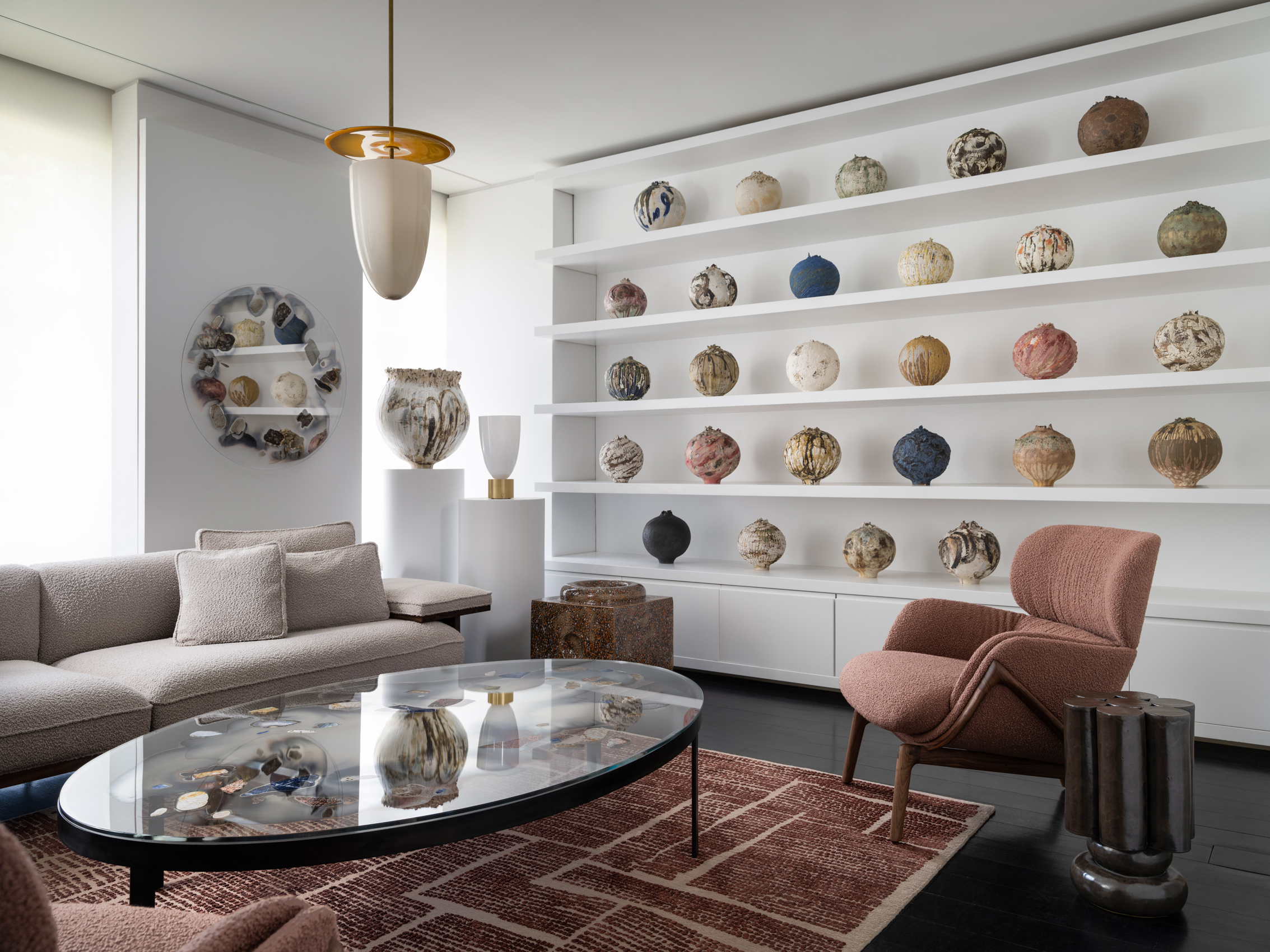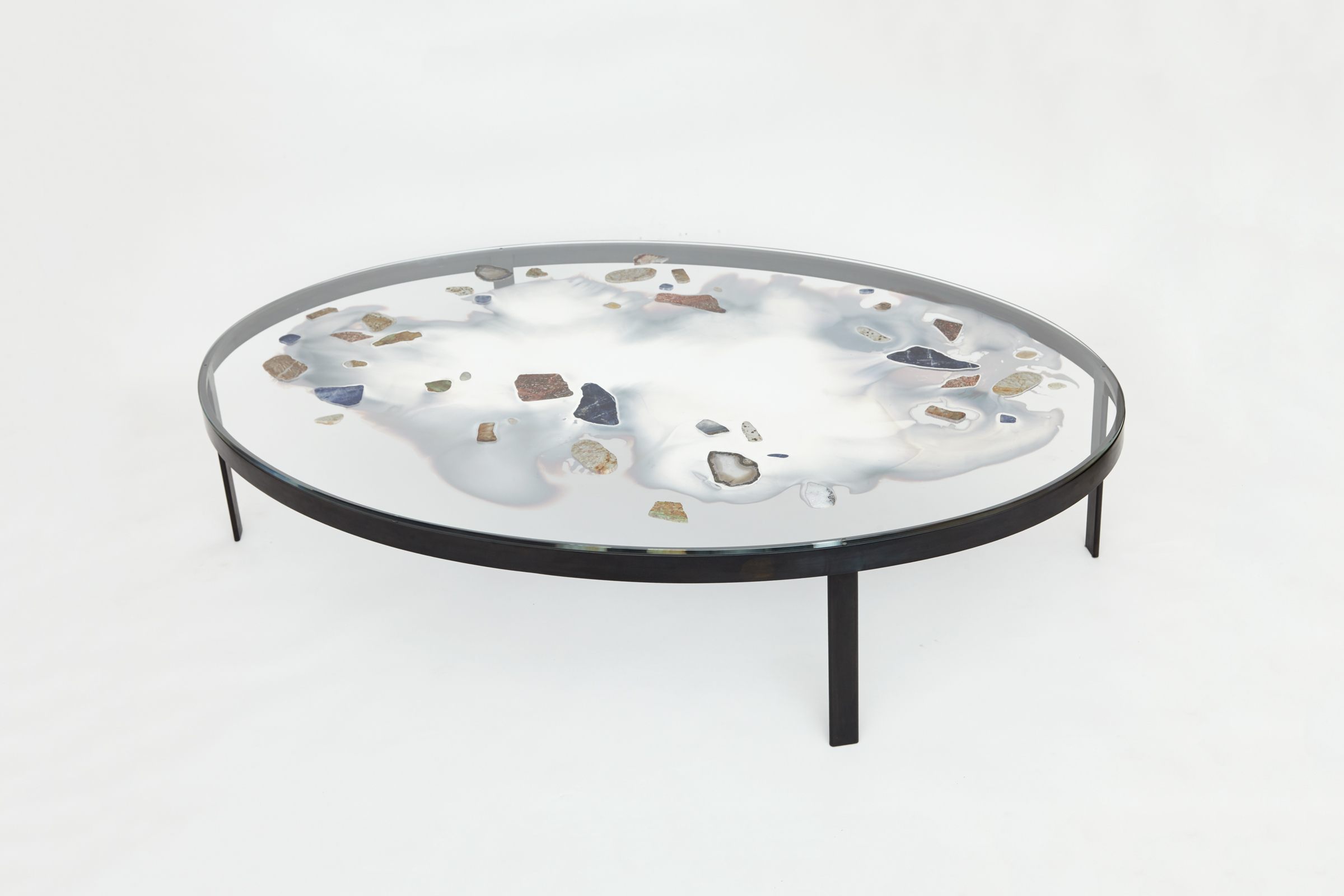 Just like their mirrors, this coffee table is made by a process wherein a silver nitrate solution is poured onto clear glass, chemically bonding to the surface. The moment of transition, which occurs at the contoured edge of the silver, is an intentional point of fragility in the construction of the surface, resulting in a moment of delicate beauty. Named as a reference to silver’s classification as a “transition metal”, this table is 72" wide and is completely one-of-a-kind.